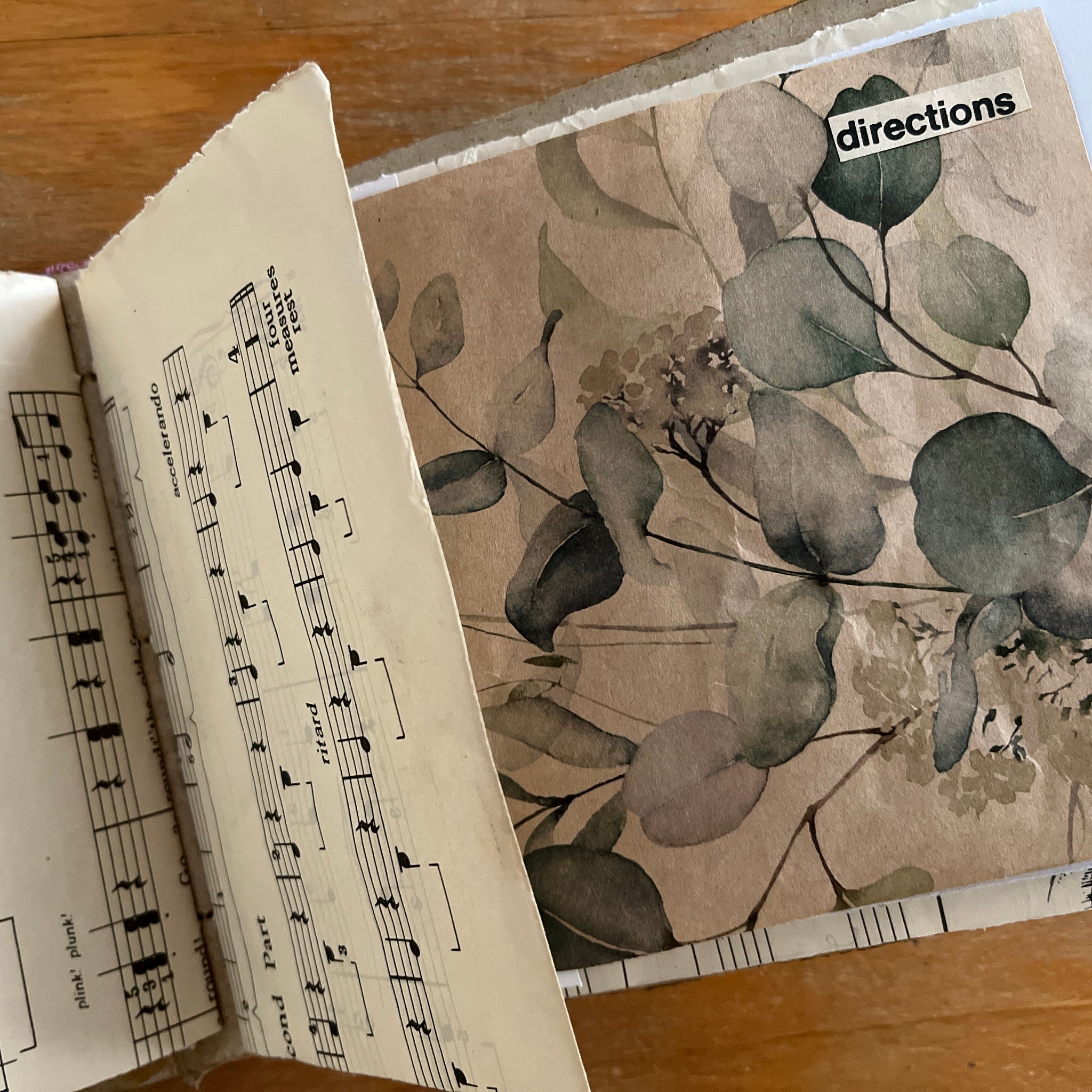 -inside are hand torn or cut pages made from a selection of vintage/upcycled papers and blank sketchbook paper