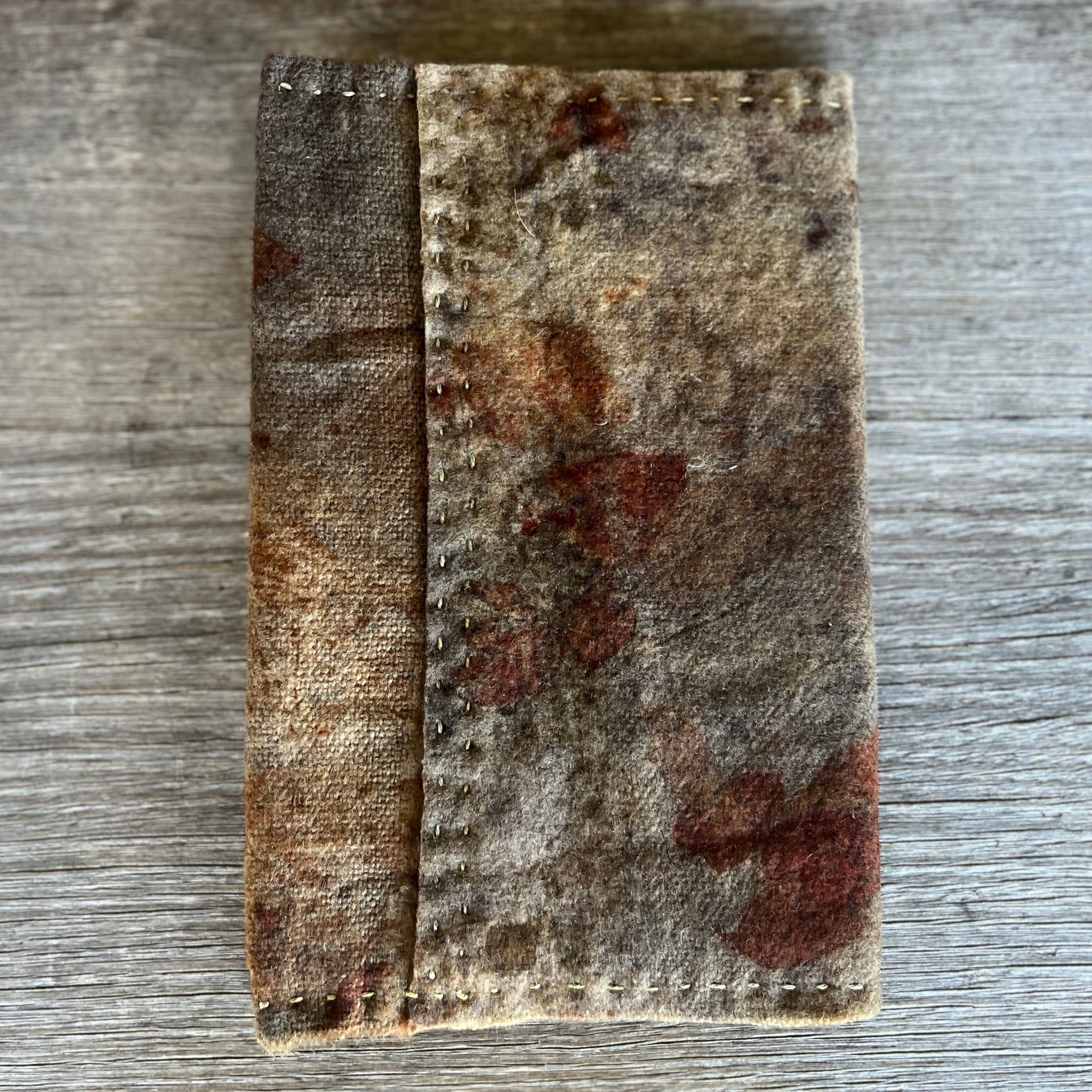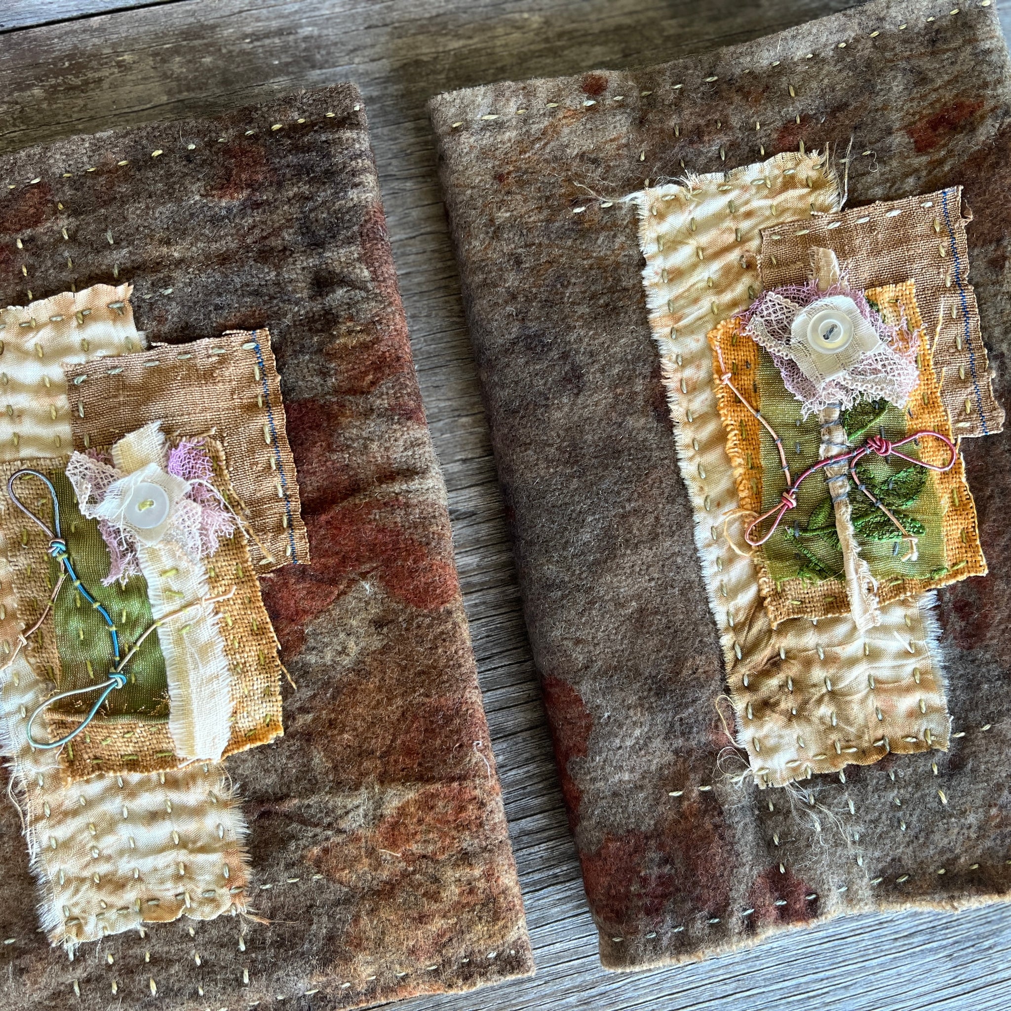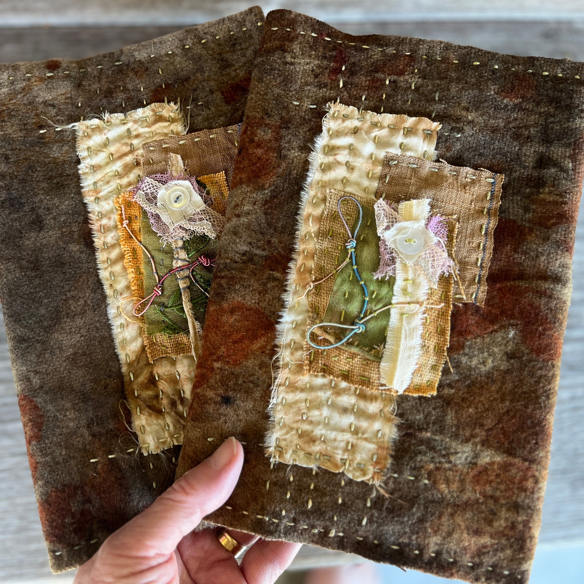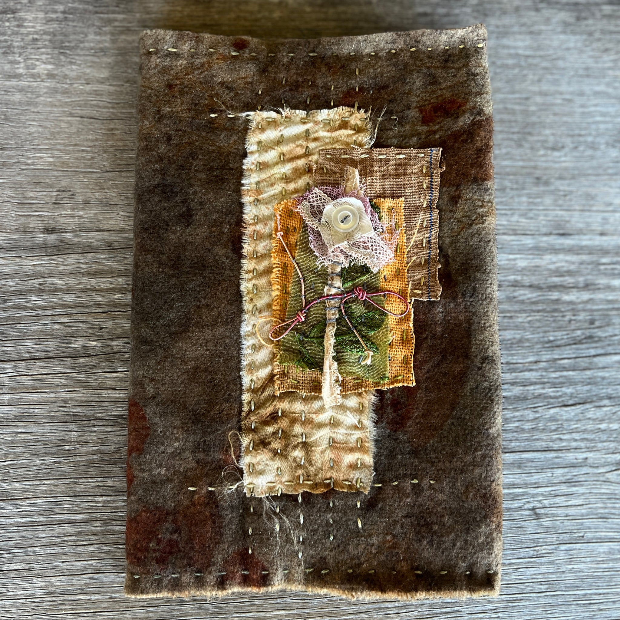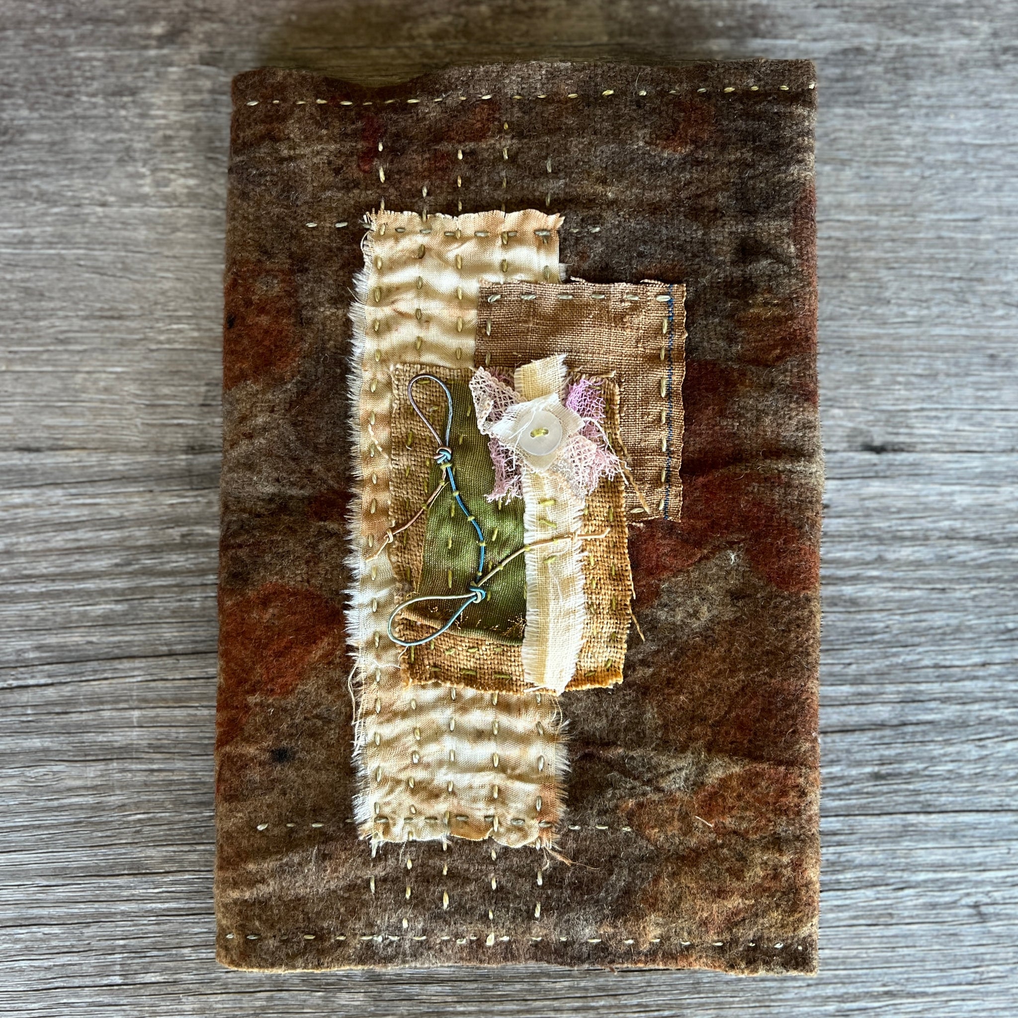 -this warm and tactile journal cover features a collage of ecoprinted silk scraps embellished with a pre-made ‘cluster’, entirely worked by hand