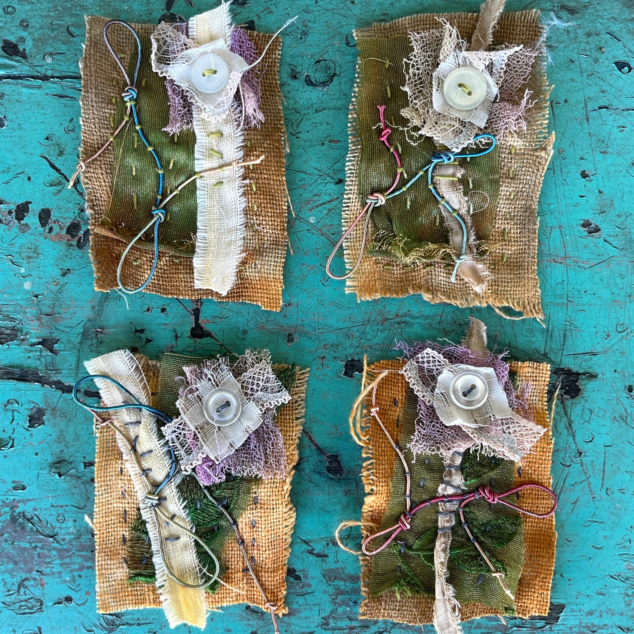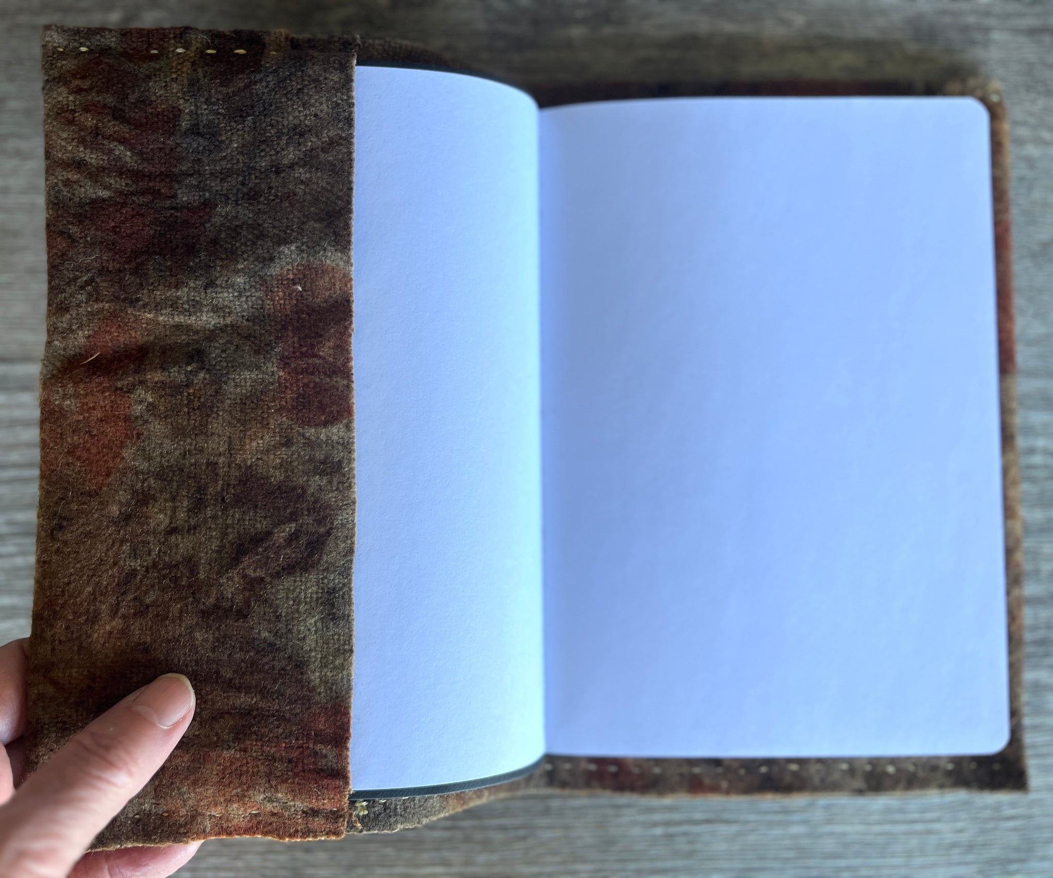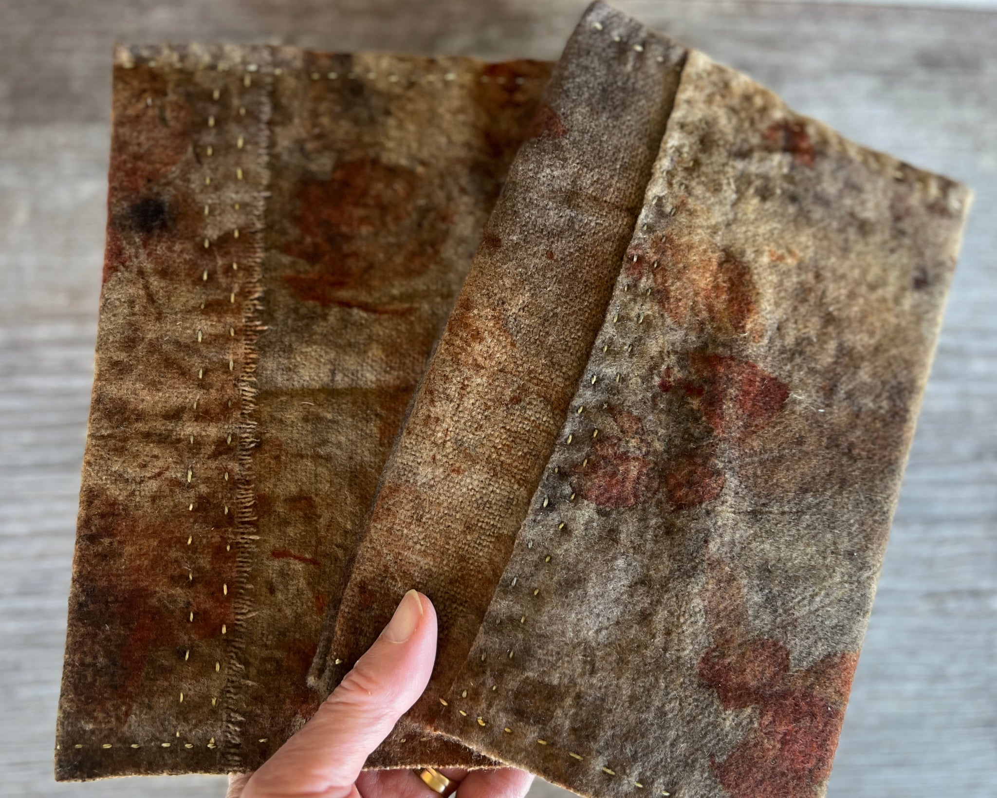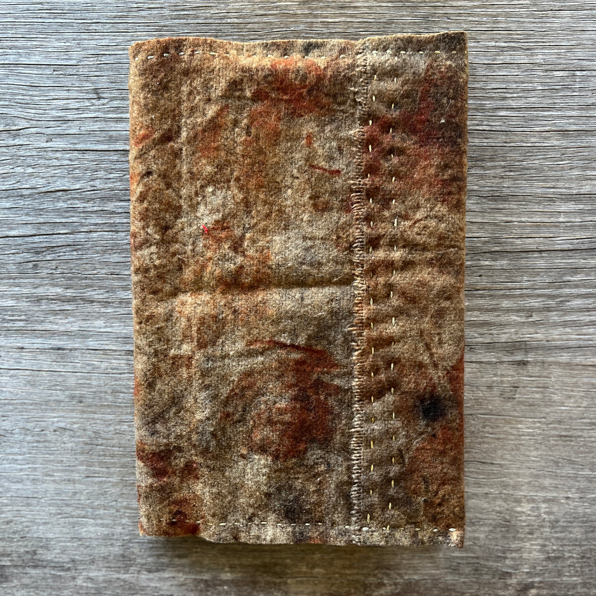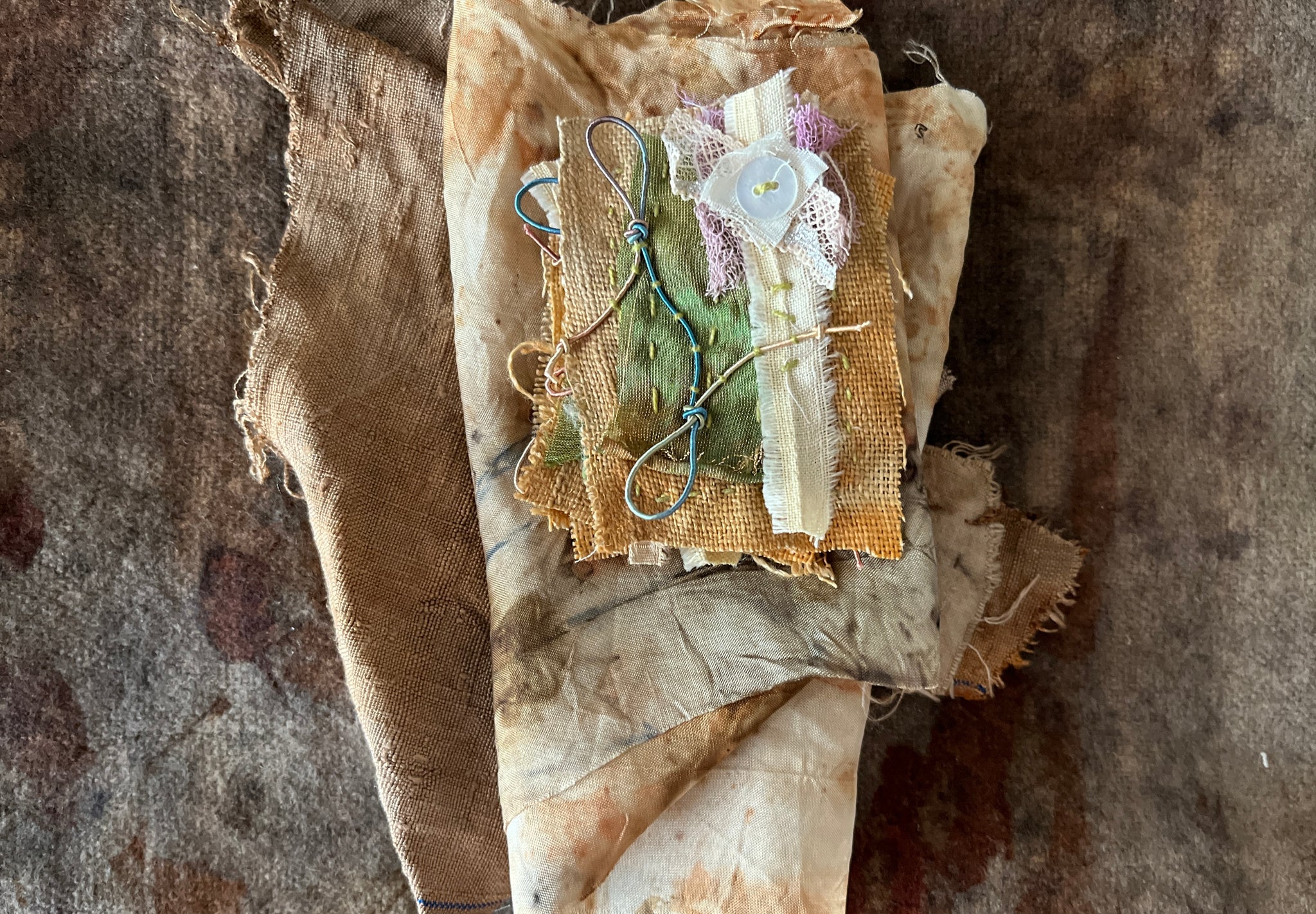 -this warm and tactile journal cover features a collage of ecoprinted silk scraps embellished with a pre-made ‘cluster’, entirely worked by hand